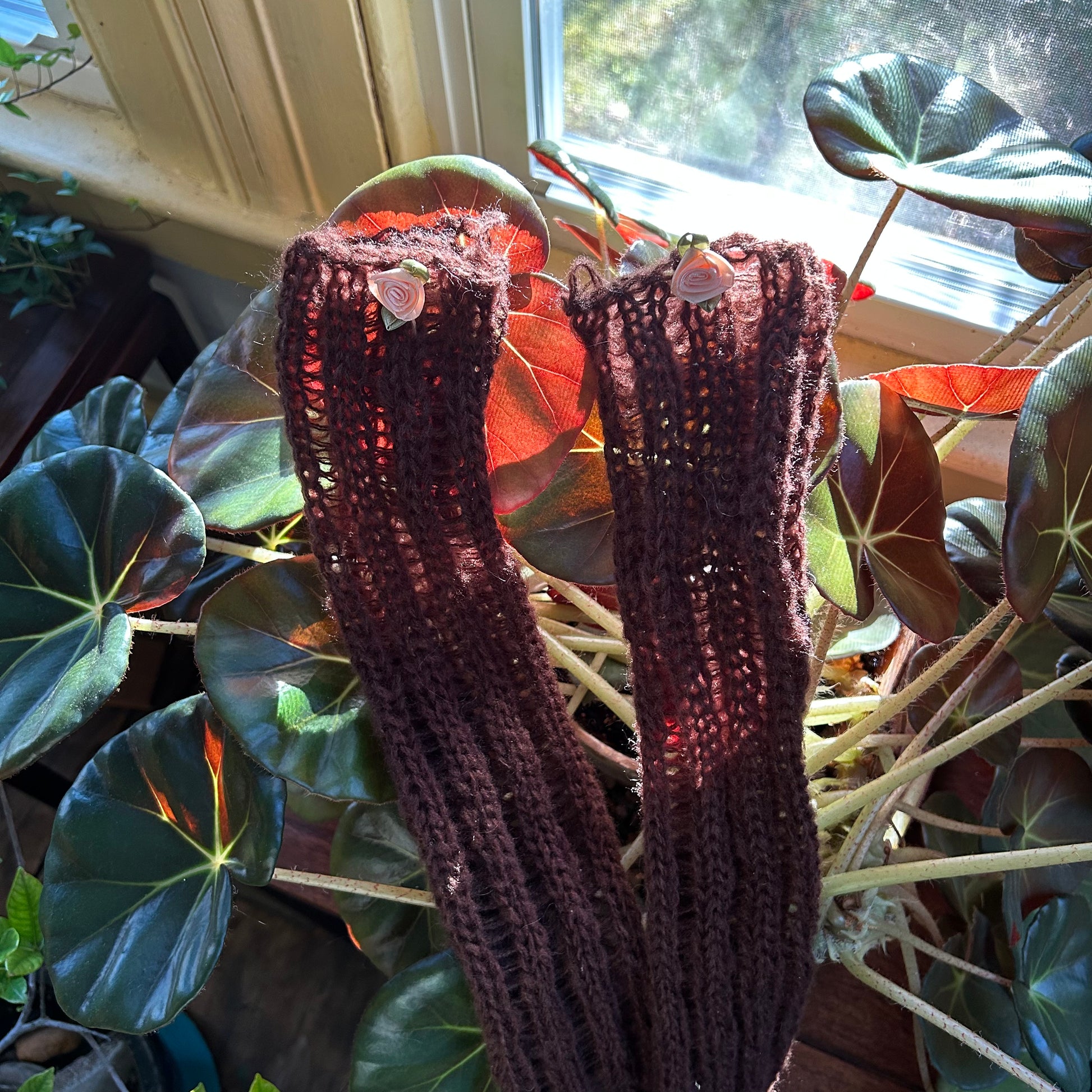 Long brown mohair arm warmers with a peach colored rose, has a thumb hole π β§βΛ β